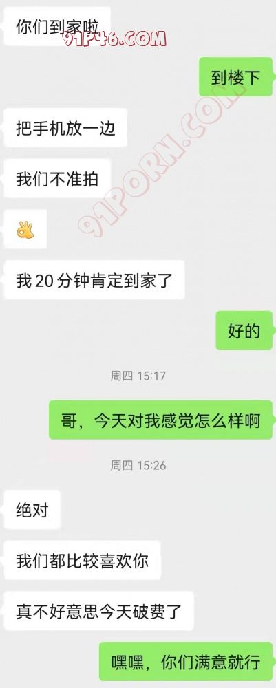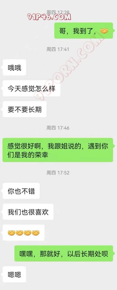 跟这对夫妻认识已经有好几年了,后面就称呼哥和姐吧,一直断断续续的联系着,但是因为一些原因也一直没有见过,前段时间一次偶然的机会,正好去哥和姐那边办事,就联系了哥和姐,想着好几年了也没见过,正好趁这次认识一下,但是哥当天正好有事走不开,我就和姐单独见了一下,其实也没什么特别的,就是去她工作的地方,简单聊了几句,然后就回去了 回去之后问了一下姐对我感觉怎么样,姐说还可以,然后跟哥聊天,哥让我多和她聊聊,如果可以,近期就活动一下,聊了几天,两个人确实感觉很聊的来,然后就有了这次三人行,具体过程我就不多介绍了,中间也没有拍照片什么的,就放两张聊天照片吧,因为隐私原因,图片裁剪了,这次特别要感谢哥和姐,第一次就让我去他们家,一是因为他们觉得酒店不安全,二,也算是对我特别的信任吧!91是个很好的平台,希望以后能够多认识一下靠谱的夫妻或者情侣,有想找靠谱单的,可以联系:玖丝把刘零把零零零,单男,还有那种还没有说好的,或者还没有准备活动的就别加了,谢谢。 .