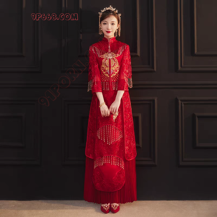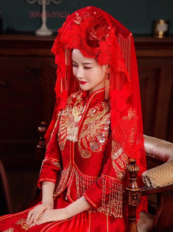 1、把酒店套房装修成新婚房间,“朵朵”新娘身穿“新娘禾秀服”在婚床上,头戴红纱,静静等待新郎入洞房;